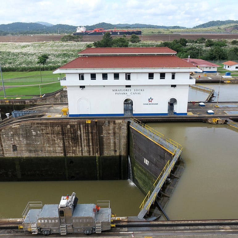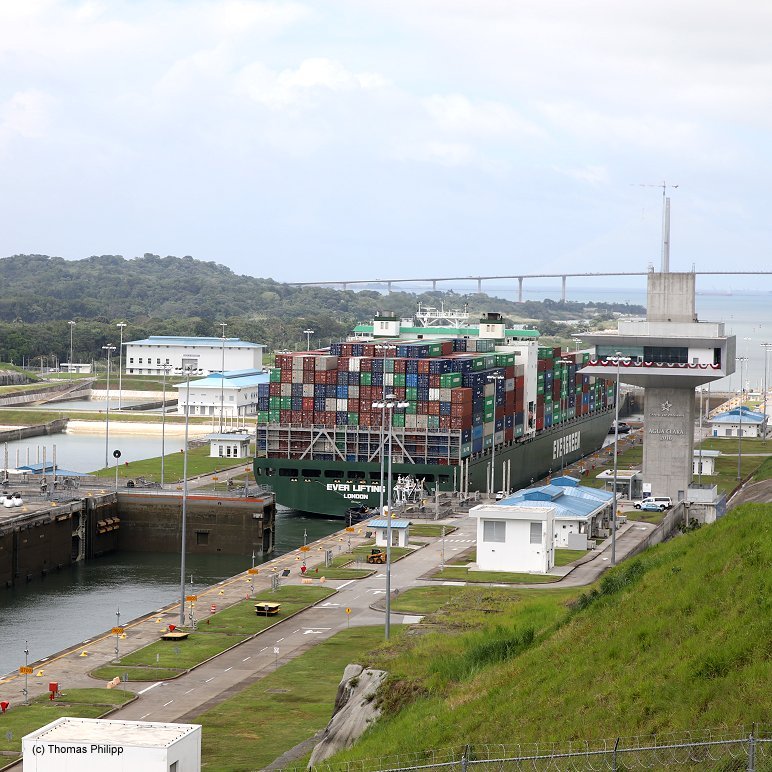 A Container ship has just enteres the 2nd chamber of the Agua Clarac